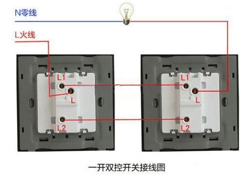 现在我们知道这五根电线的定义了就开始连接,将蓝色线与零线连接,另一头与灯的一根线连接:零线接完开始接火线,将火线进线一头接火线,一头接第一个开关的L点端子,然后再将两根控制火线分别接开关上L1和L2点端子,两根控制火线另一头接第二个开关的L1和L2点端子,最后还剩一根控制火线出线,接第二个开关的L点端子,另一头接灯的另一根线。
